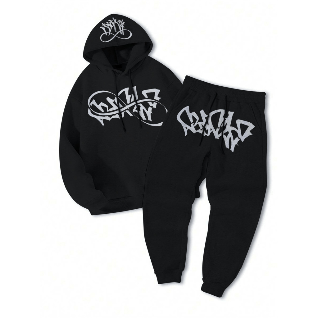 2 Peças/Moletom Canguru e Calça Streetwear Tag Graffiti Central Cee Hip Hop Aesthetic