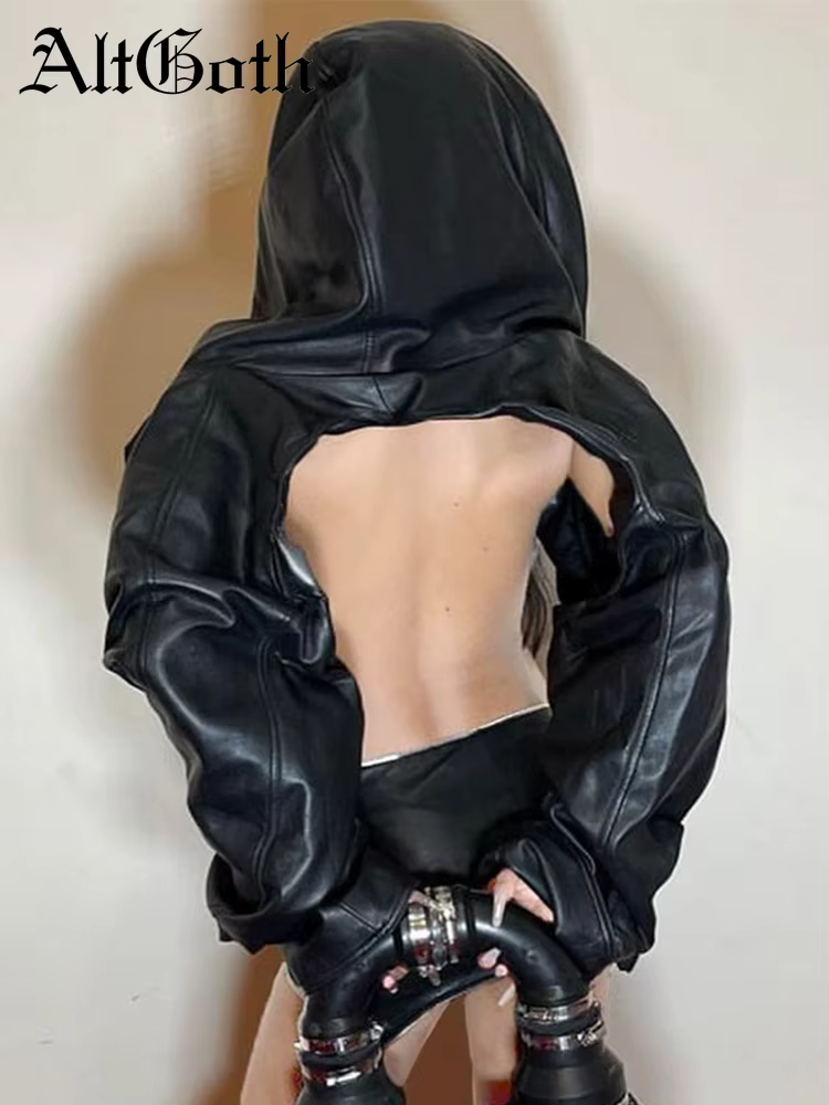 AltGoth-Jaqueta Feminina Cyberpunk Gótica Negra de PU Crop, Streetwear Harajuku, Hip Hop, Emo Alt, Manga Comprida, Moletons de Couro, Casacos Femininos