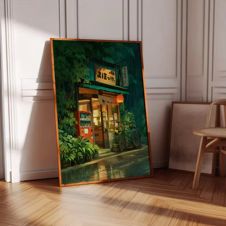 Anime café loja e bicicleta cartaz de lona ghibli trabalho anime estilo rua café cena arte da parede impressão para sala estar decoração casa