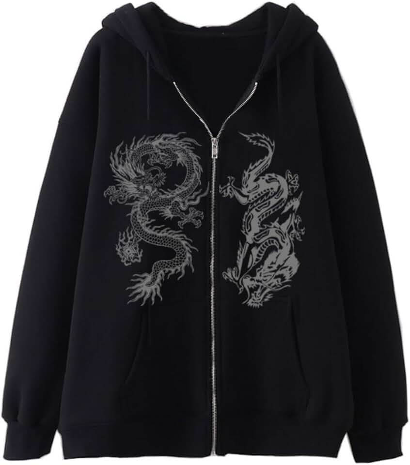 Aobiono Moletom feminino masculino Y2K com capuz e zíper grande dragão gótico gráfico Emo Grunge Alt Baggy Jaqueta de lã anos 90 Punk Streetwear