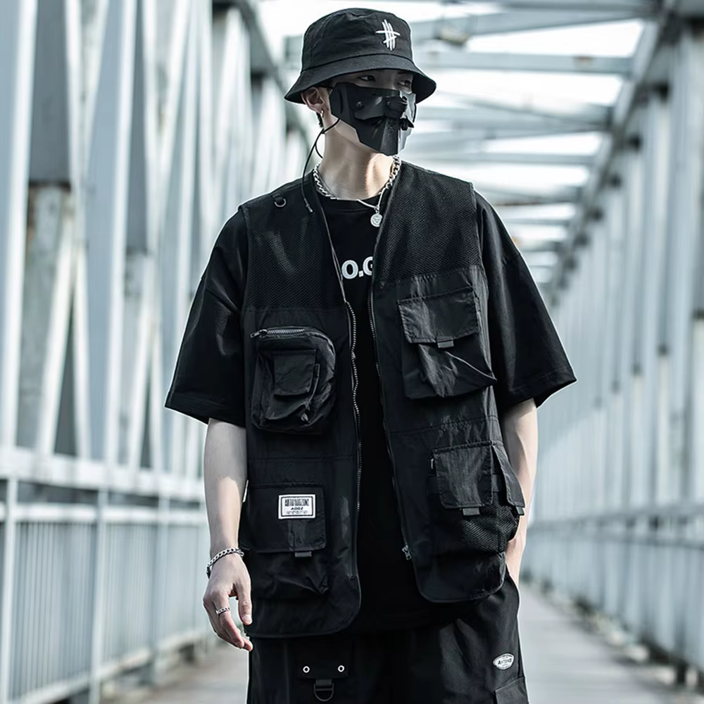 Aogz streetwear hip hop multi bolsos com zíper colete de carga masculina techwear coletes outwear tático funcional colete sem mangas
