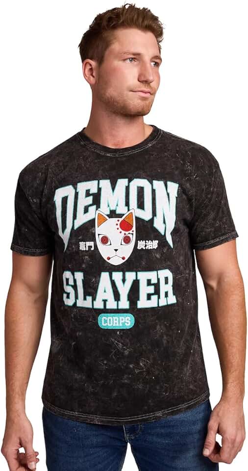 Bioworld Demon Slayer Tanjiro Fox Mask Camiseta masculina preta lavagem mineral gola redonda manga curta