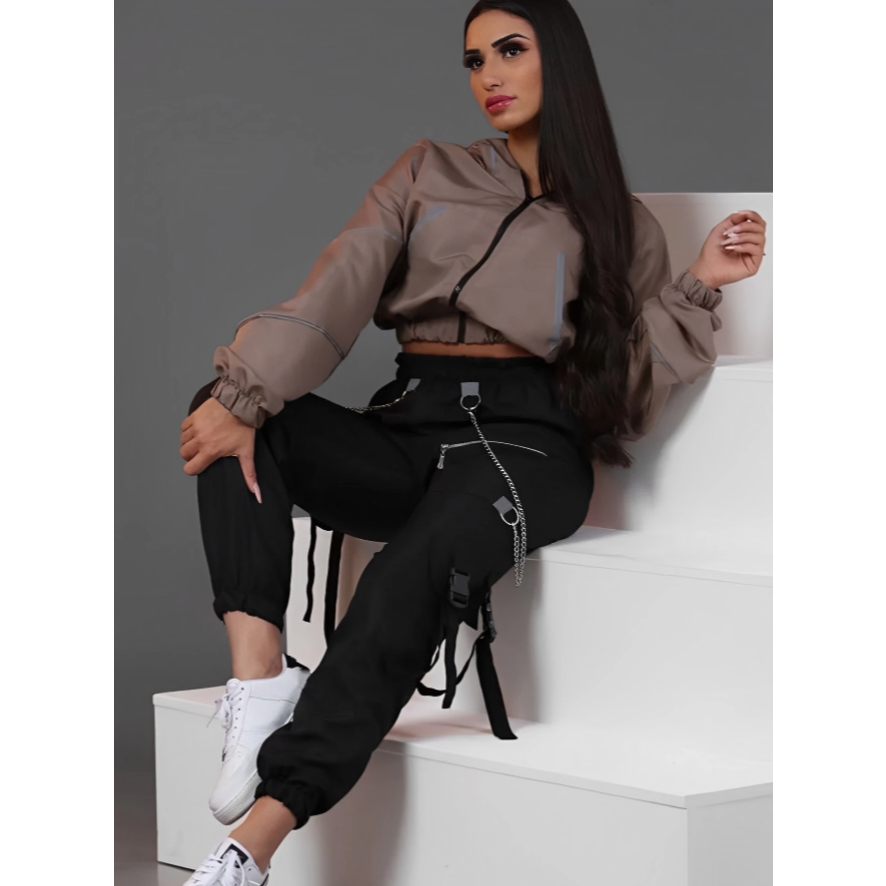 Calça Jogger Feminina Preta com Correntes Moda Urbana Street Tactel