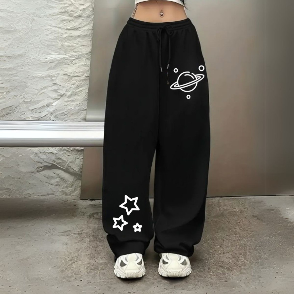 Calça Wide Leg Cargo Wide Leg Planetinha Estrelas Minimalista Baggy Algodão Casual Streetwear