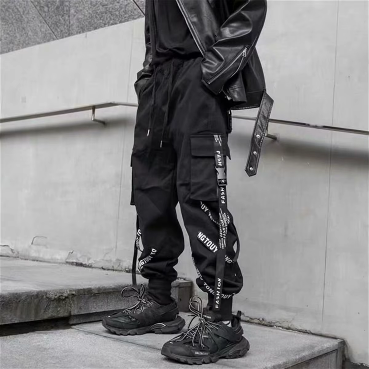 Calças de carga pretas dos homens joggers calças de carga para homens jogging japonês streetwear hip hop hippie techwear calças de fita gótica