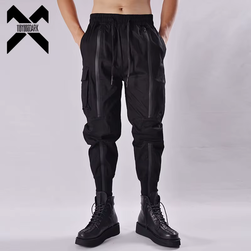 Calças táticas funcionais para homens, corredores pretos, calças elásticas na cintura, streetwear hip hop, design com zíper, techwear, wb376