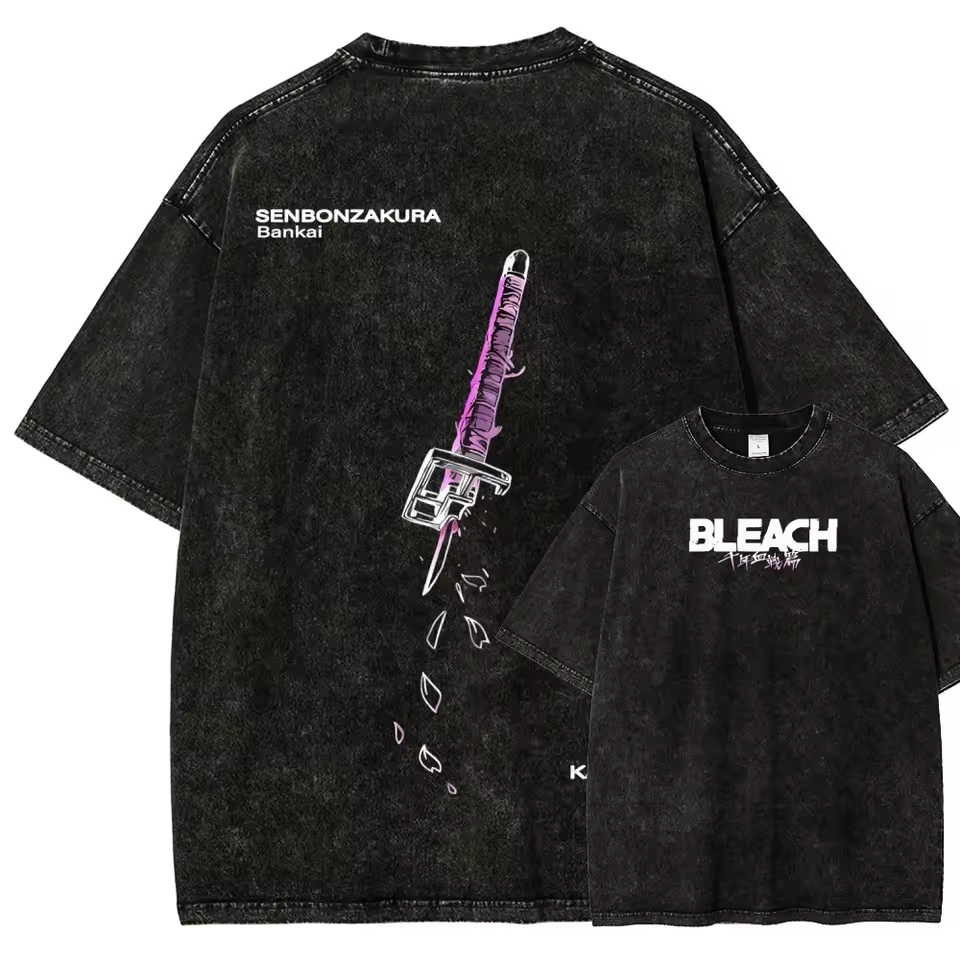 Camiseta Estonada Lavada Vintage Bleach Ichigo Kurosaki Bankai Kenpachi Knight Anime Graphic Unissex