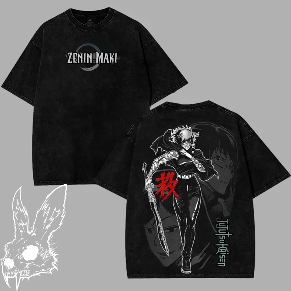 Camiseta Estonada Lavada Vintage Maki Zenin Sorcerer Killer Jujutsu Kaisen Behind Graphic Unissex