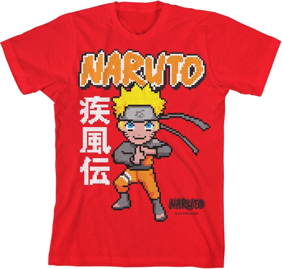 Camiseta masculina com estampa vermelha Naruto Shippuden Chibi personagem Pixel Art