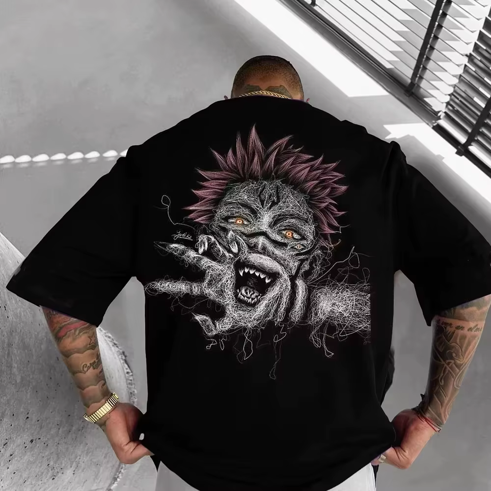 Camiseta Gráfica Jujutsu Kaisen Sukuna Masculina Preta com Estampa de Vilão de Anime, Tamanho Grande, Estilo Streetwear, Confortável e Macia