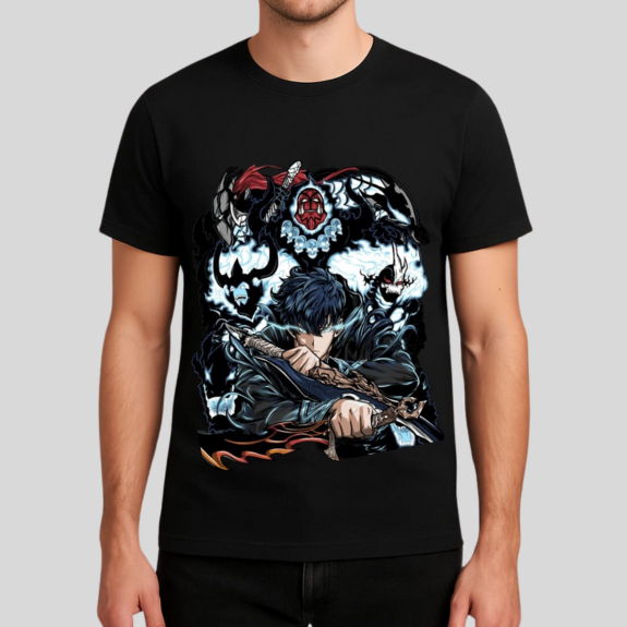 Camiseta Solo Leveling Anime Jin-Woo Unissex Preta 100% Algodão