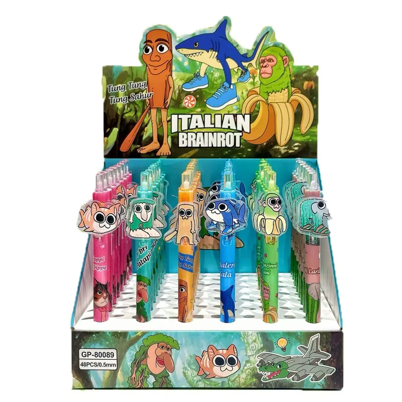 Conjunto de 6 Canetas Gel Pretas 0.5mm AI Brainrot Press Pen, Papelaria Kawaii, Artigos Derivados de Desenhos Animados e Anime, Material Escolar e de Escritório