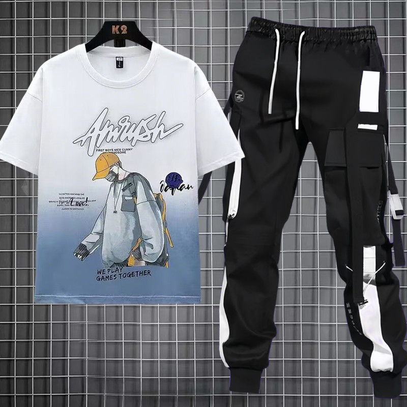 Conjunto De Camiseta Moderna Gradiente Anime Streetwear E Calças Cargo Funcionais – Agasalho Masculino Diário Casual