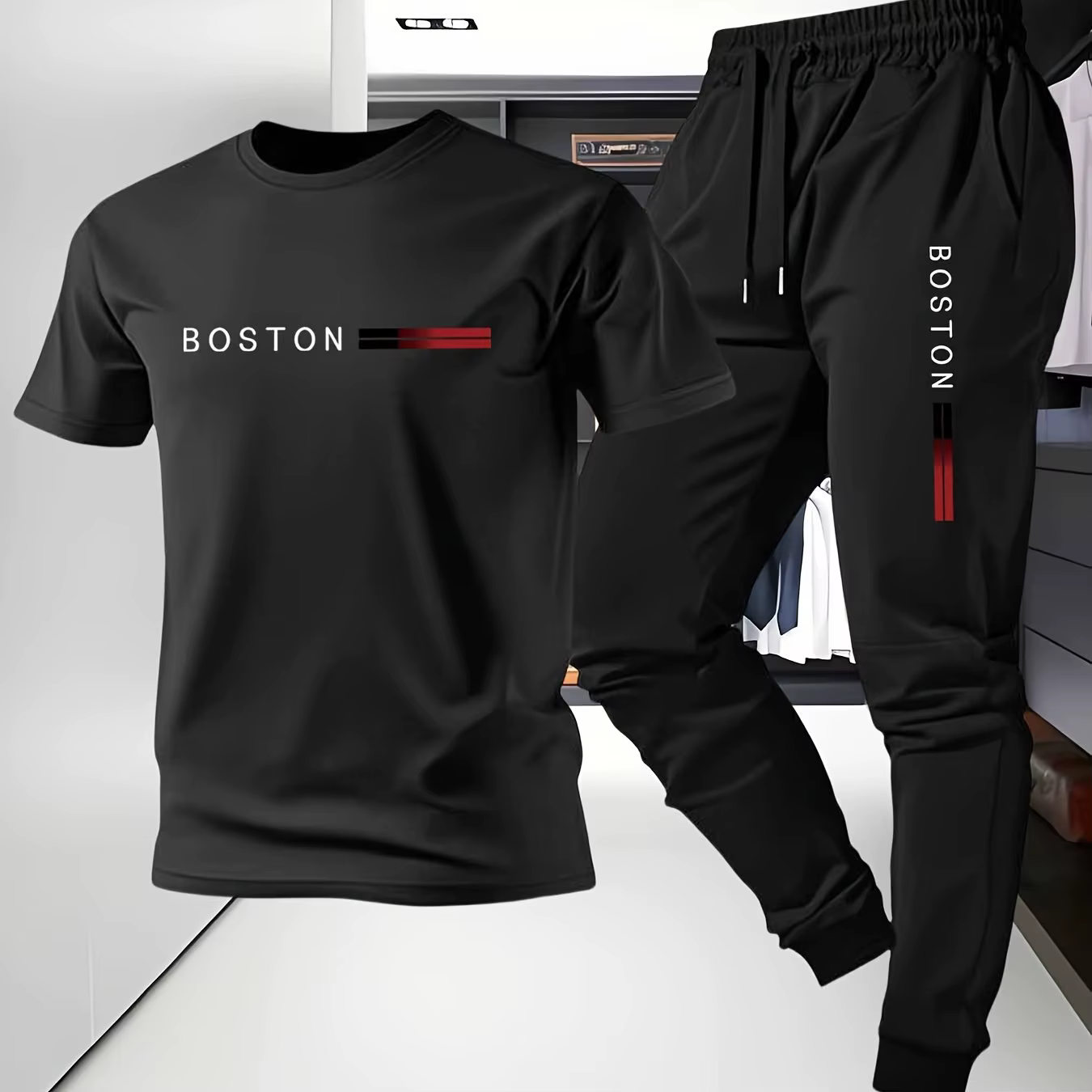 Conjunto de Treino Boston Masculino de 2 Peças – Camiseta Preta e Calças Jogger | Mistura de Algodão Premium | Roupas Casuais para Estilo Urbano