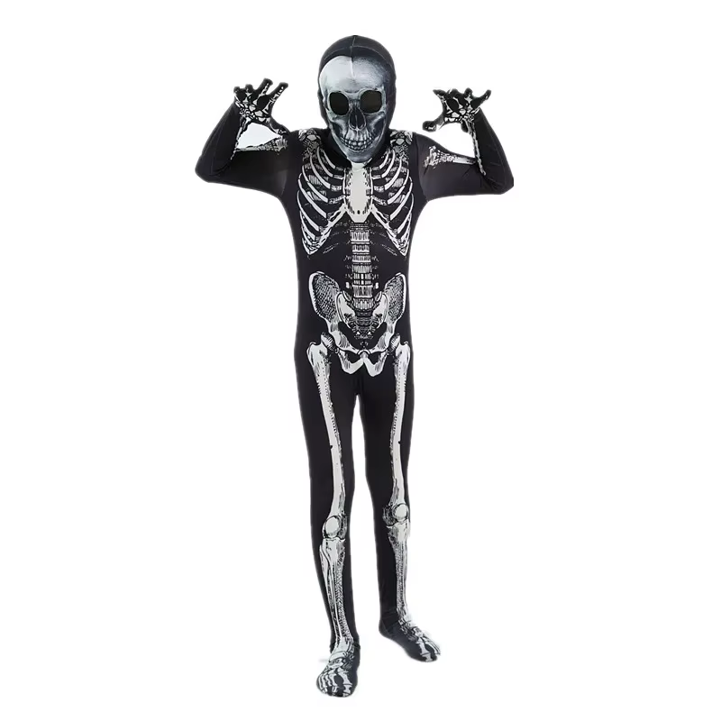 Esqueleto com capuz para crianças, calças justas de Halloween, performance de carnaval, horror assustador escuro, dramatização, criança