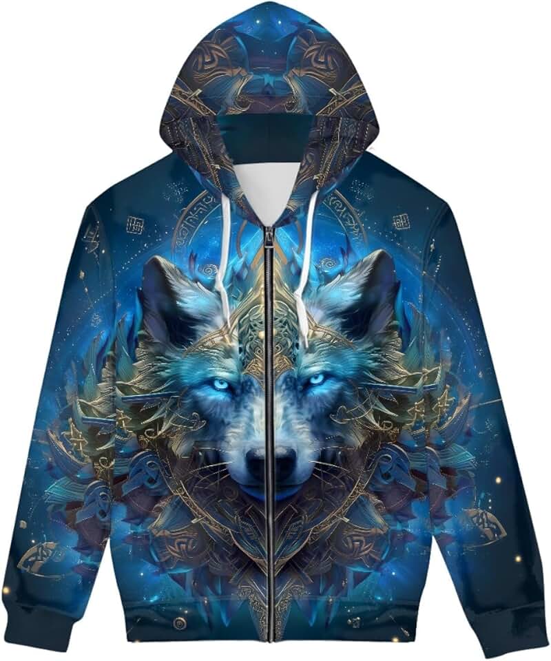GLUDEAR Moletom masculino com capuz e estampa digital 3D de lobo legal e zíper
