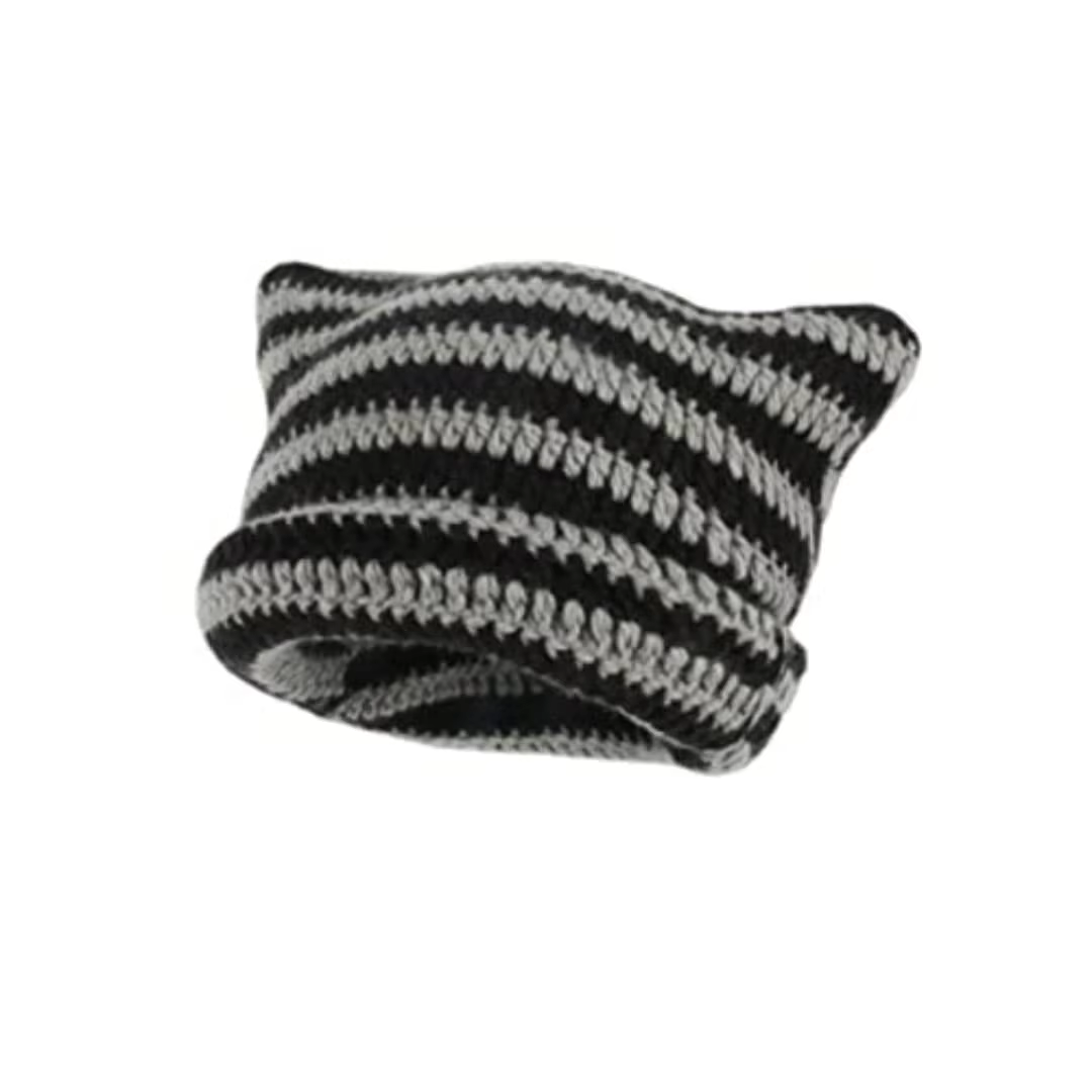 Gorro com orelhas de gato fofo para mulheres inverno listrado coreano punk gótico y2k lã malha streetwear artesanal crochê balde boné
