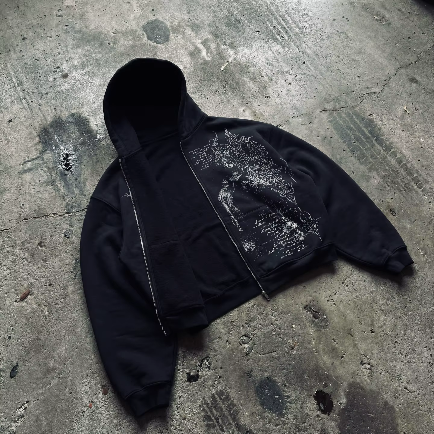 Gótico escuro preto metal zip up hoodie angustiado branco espinho cruz gótico texto impressão oversized recortado unisex streetwear
