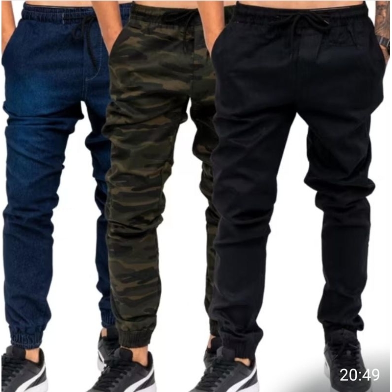 Kit 3 Calças Jogger Jeans, Sarja Preta, Camuflada, Moda Urbana, Streetwear, Lycra, elastano