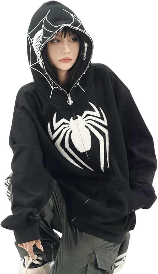 LREUIP Moletom com capuz Y2K Hip Hop Spider para mulheres e homens, estampado, com zíper, tamanho grande, kawaii, gótico punk, Preto, G