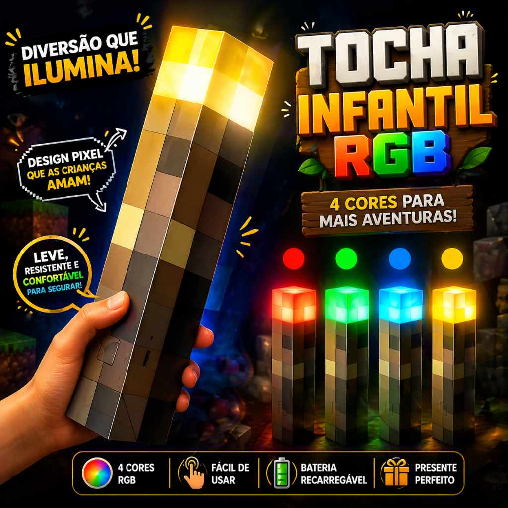 Luminária Tocha Minecraft RGB LED 4 Cores Gamer Infantil Abajur Recarregável USB Pixel Blocos Quarto