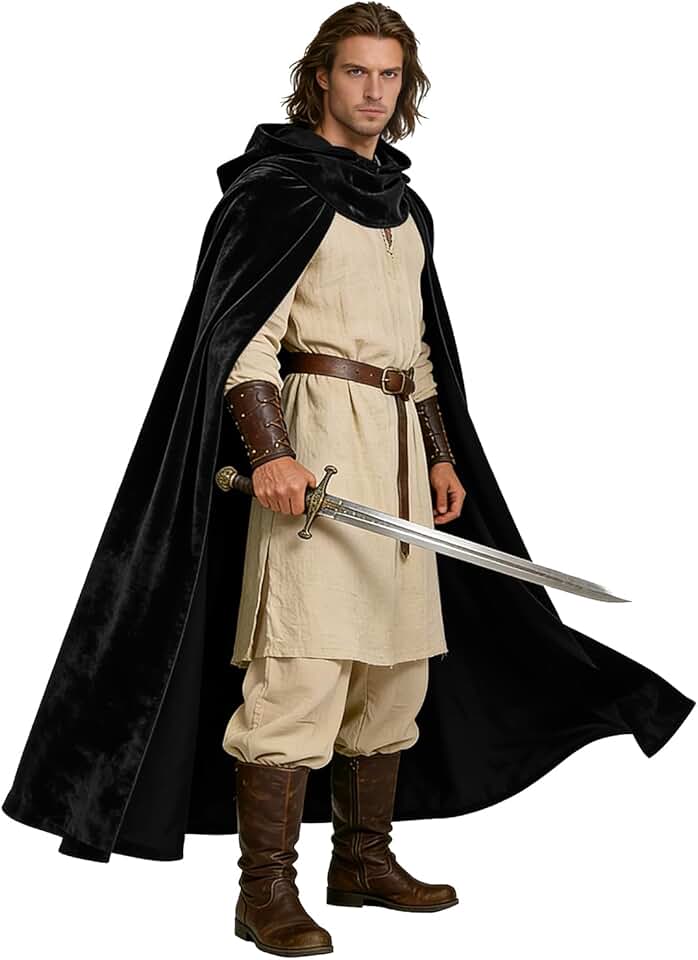 L'VOW Capa com capuz medieval preta com capuz renascentista para cosplay de Halloween Assassin Creed Ninjia