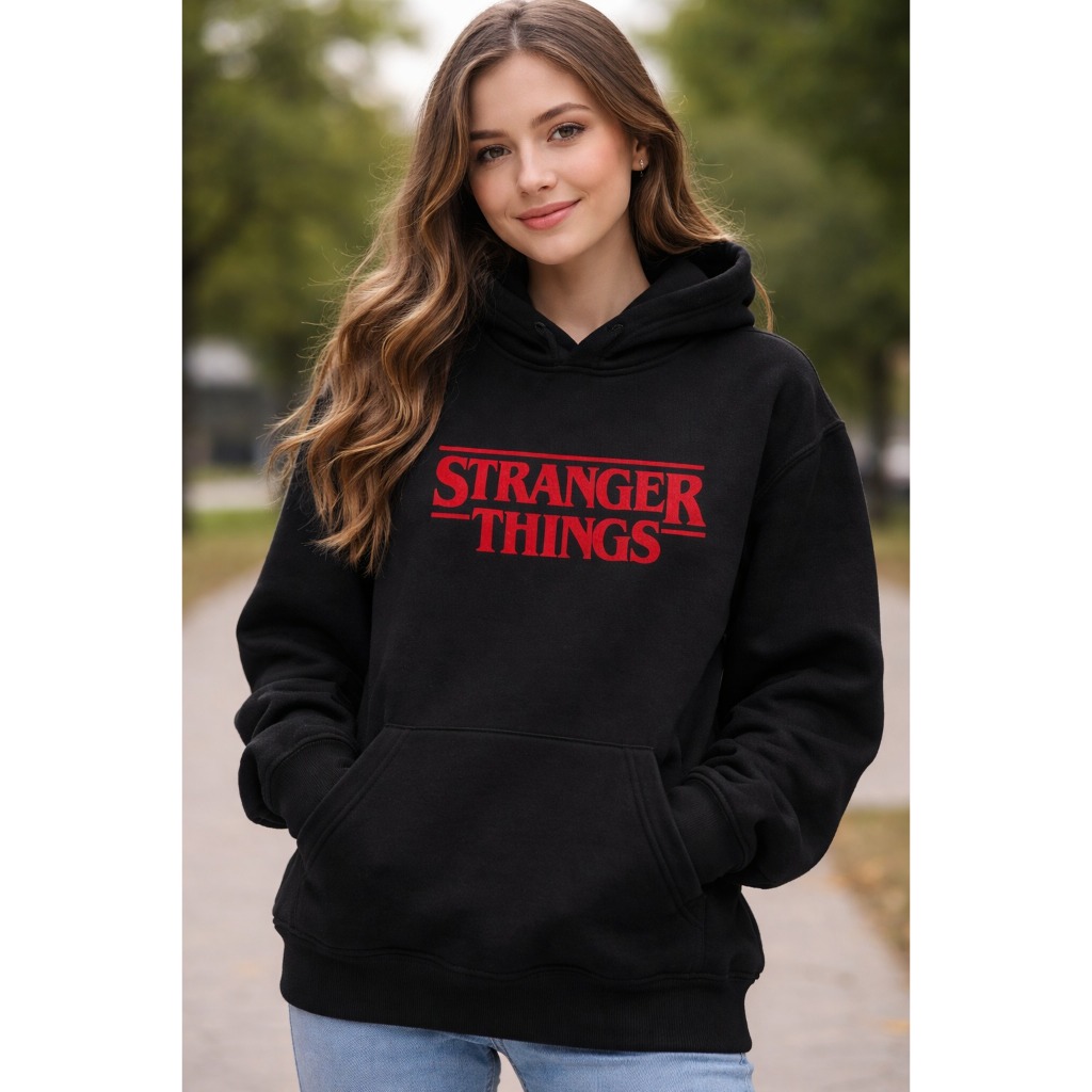 Moletom Canguru Unissex Stranger Things Preto com Capuz | Blusa de Frio Geek Séries Netflix Inverno