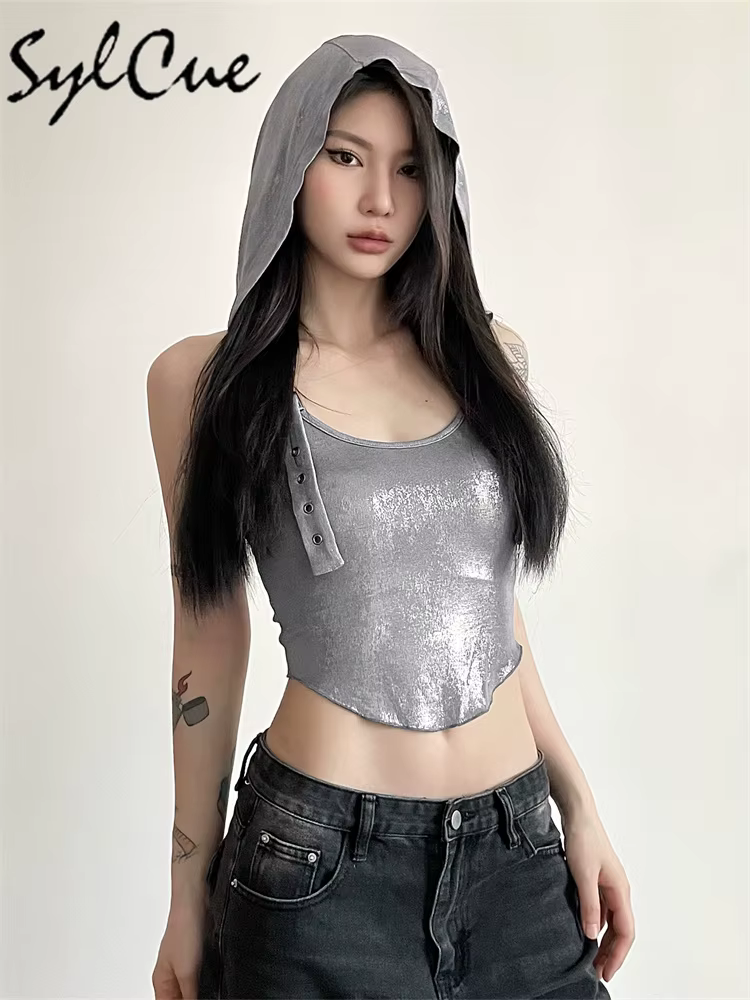 Nibber prata retro fosco cyberpunk moda high street sexy maduro confiante legal simples feminino verão fino colete com capuz