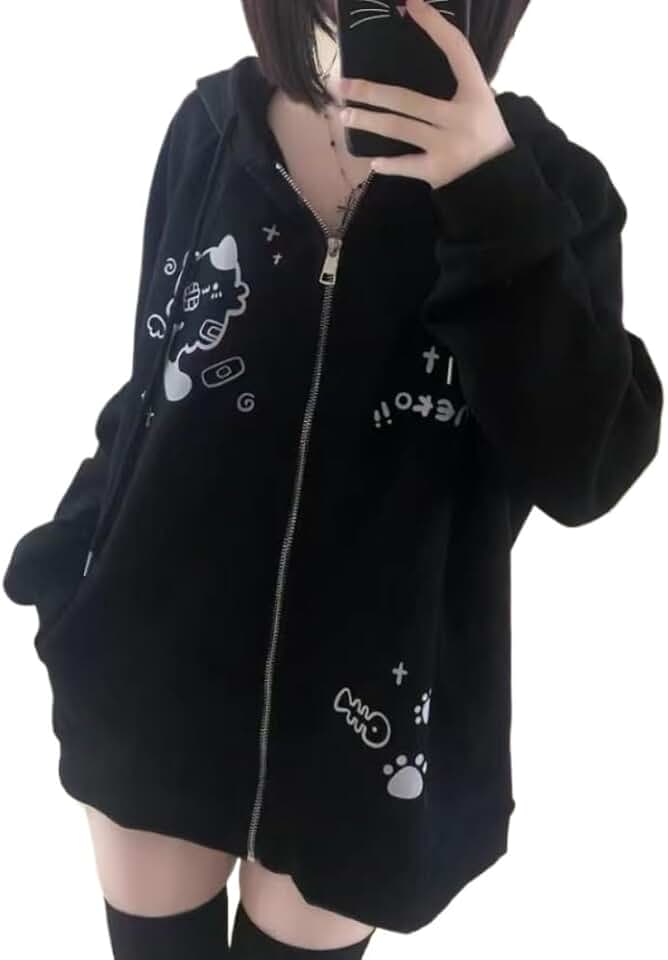 Pooyikoi Moletom feminino com capuz Harajuku, leve, preto, gótico, Y2k, fino, moderno, fofo, com zíper