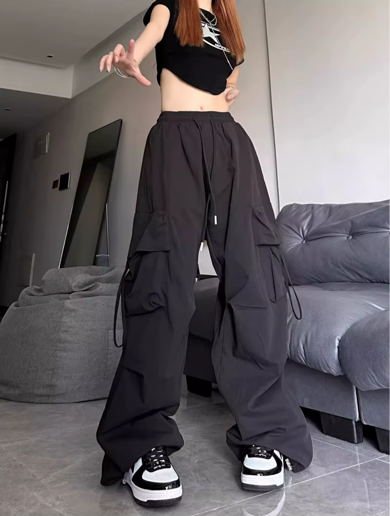 Rasgado y2k calças de carga femininas moda vintage hip hop solto cintura alta bolso baggy calça casual streetwear cordão moletom