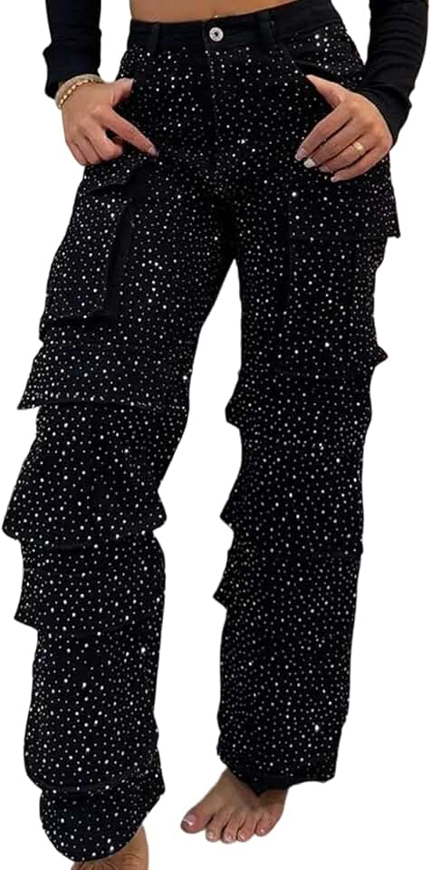 SHINFY Jeans cargo feminino com strass Y2K Baggy Straight Wide Leg Sparkly Denim Cargo Pants com bolsos