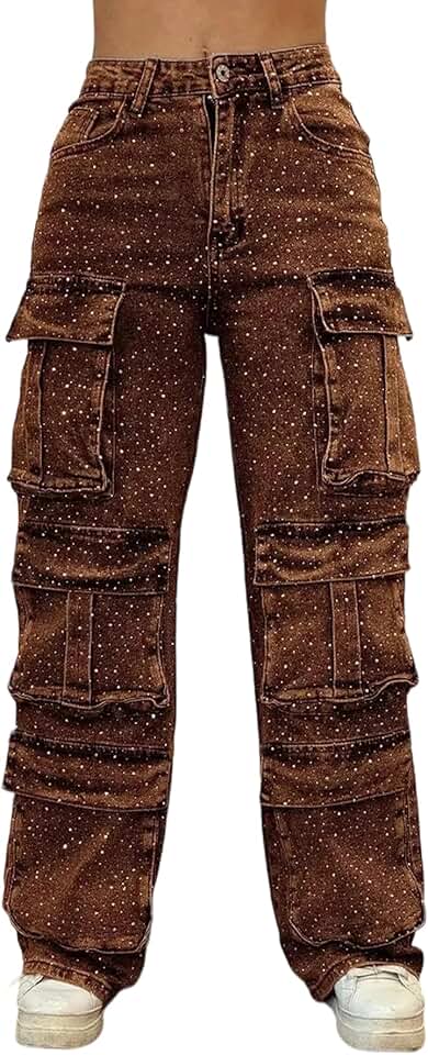 SHINFY Jeans cargo feminino com strass Y2K Baggy Straight Wide Leg Sparkly Denim Cargo Pants com bolsos