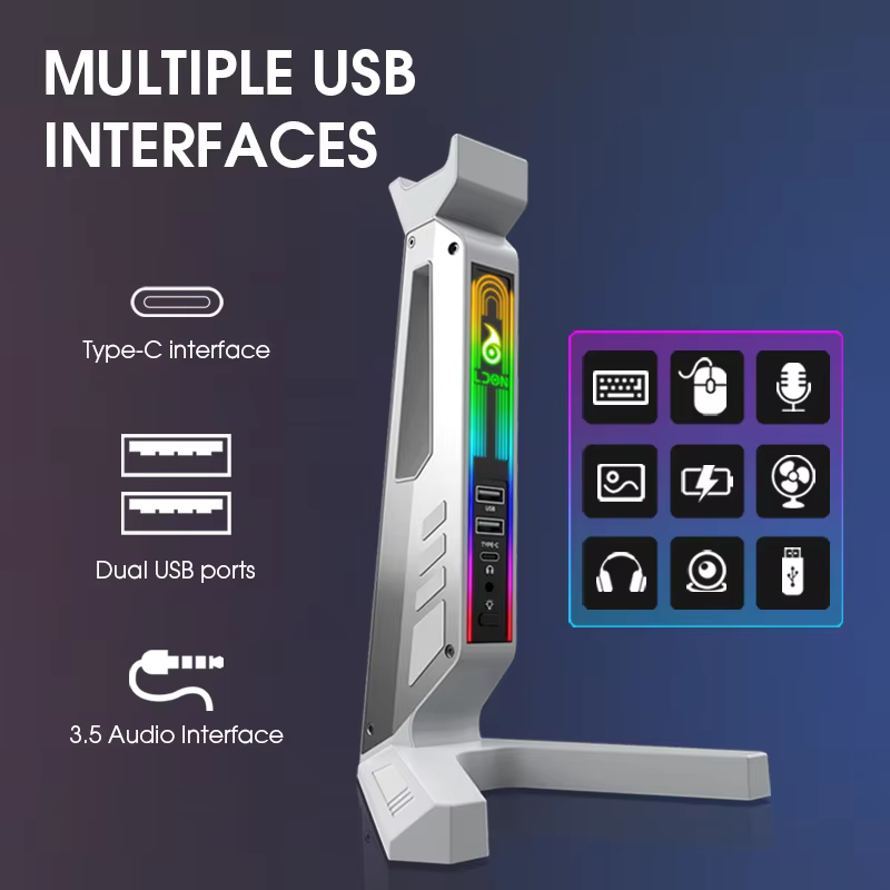 Suporte para fone de ouvido para jogos RGB com luzes ativadas por som, doca de carregamento USB LED de 11 modos, suporte para fone de ouvido para PC Gamer